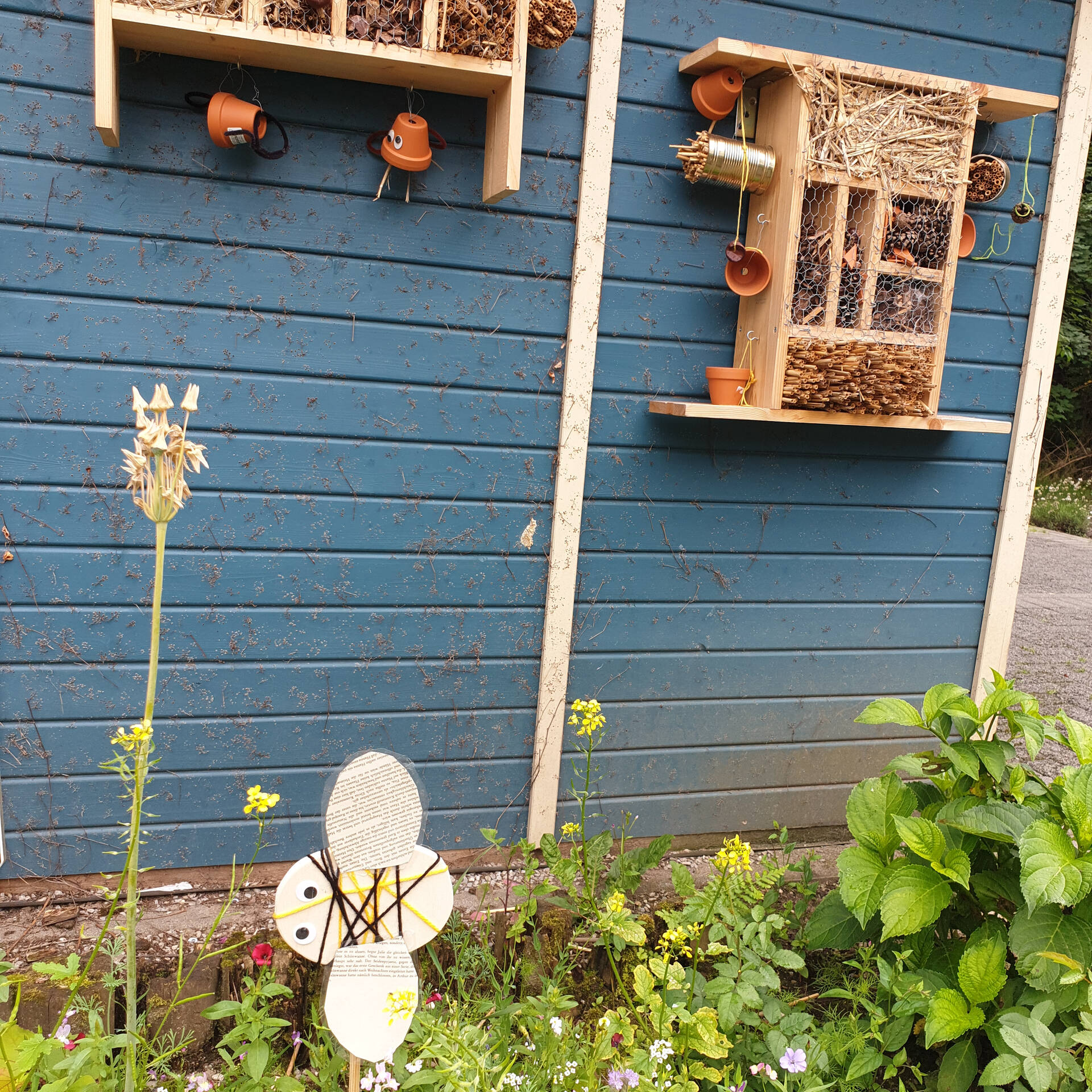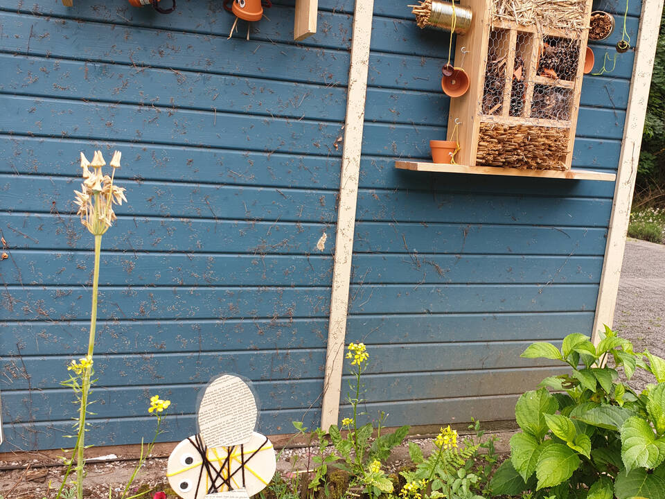 Des Weiteren gab es im Herbst 2020 an vier Vormittagen für die Kinder der KiTa ein Insektenhotelbauprojekt in Kooperation mit dem Treffpunkt Eickel. Dabei haben die Kinder vier Holzkästen mit verschiedenen Materialien, wie Tannenzapfen, Bambusstäben, Stroh, Tonscherben und Rindenmulch gefüllt und am Schluss mittels eines Hammers und Nägeln den Kaninchendraht befestigt, damit die Füllmaterialien nicht wieder rausfielen. Die Insektenhotels hängen nun im Eingangsbereich der KiTa und sind hoffentlich für viele Tiere ein zu Hause, während des Winters. Im Frühling 2021 wurden gemeinsam mit den Kindern unter den Kästen und an verschiedenen Stellen in den KiTa Gärten Wildblumenwiesen für die Insekten ausgesät.