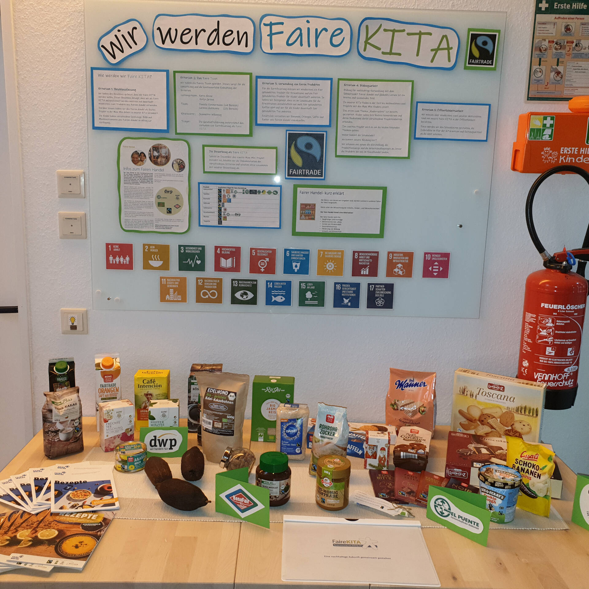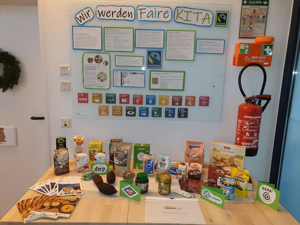 Für die Zertifizierung zur „Fairen KiTa“ müssen wir verschiedene Kriterien erfüllen. Zunächst haben wir ein Faires Team gebildet. Dieses besteht aus dem Leitungsteam der KiTa, zwei Mitarbeiterinnen und einer Elternvertreterin. Dieses Team ist für die Umsetzung der Kriterien in der KiTa verantwortlich. Wir haben uns dazu entschieden langfristig für Erwachsene nur noch fair gehandelten Kaffee und für die Kinder fair gehandelten Tee in der KiTa anzubieten. Für die Maxi Mini Kinder sind mehrtägige Projekte geplant. Die Kinder werden im Projekt „Kinderrechte“ die 10 wichtigsten Rechte genauer kennenlernen. Es ist für uns sehr wichtig, dass Kinder ihre Rechte kennen und lernen, das sie diese auch einfordern dürfen. Wir möchten Kinder dafür sensibilisieren, dass die Kinderrechte zwar für alle Kinder der Welt gelten, aber längst nicht überall gelebt und umgesetzt werden. In einem zweiten Projekt erkunden die Maxi Mini Kinder verschiedene Produktionswege unserer Nahrungsmittel, bzw. unserer Kleidung. Wir beschäftigen uns mit den Themen: Wo kommt die Schokolade her? Wo wachsen die Bananen? Wie kommt meine Jeans in den Kleiderschrank? Welche Reise macht mein T-Shirt? Bei all den Themenbereichen schauen wir auch immer auf die Arbeitsbedingungen während der Produktion, schauen ob die Kinderrechte berücksichtigt werden und ob auf die Gesundheit der Arbeiter geachtet wird. Wir stellen den Kindern fair produziertes Spielzeug und verschiedene Musikinstrumente zum Spielen bereit. Im Sommer 2021 hat uns die Umweltmanagerin der Stadt Herne Jana Ermlich in der KiTa besucht und uns fair hergestellte Fußbälle als Geschenk mitgebracht.
